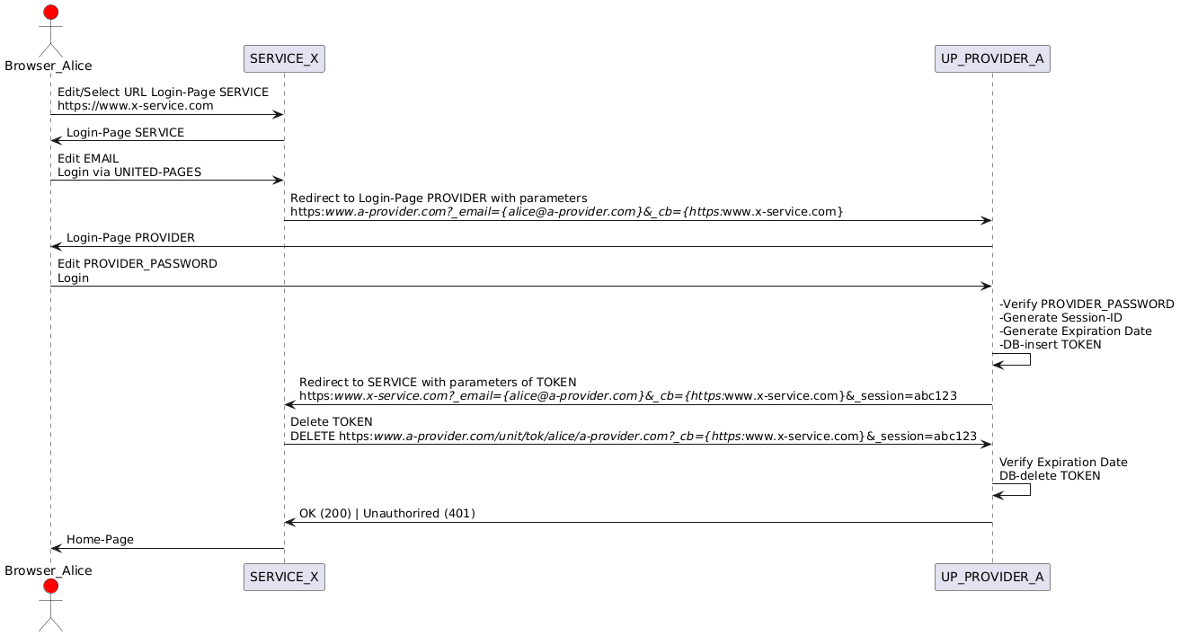 In the following example, Alice (alice@a-provider.com) logs in to a SERVICE (x-service.com) via UNITED-PAGES. For better readability, curly braces {} are used (e.g., {https://www.x-service.com/home.html} instead of URL-encoded https:%2F%2Fwww.x-service.com%2Fhome.html).